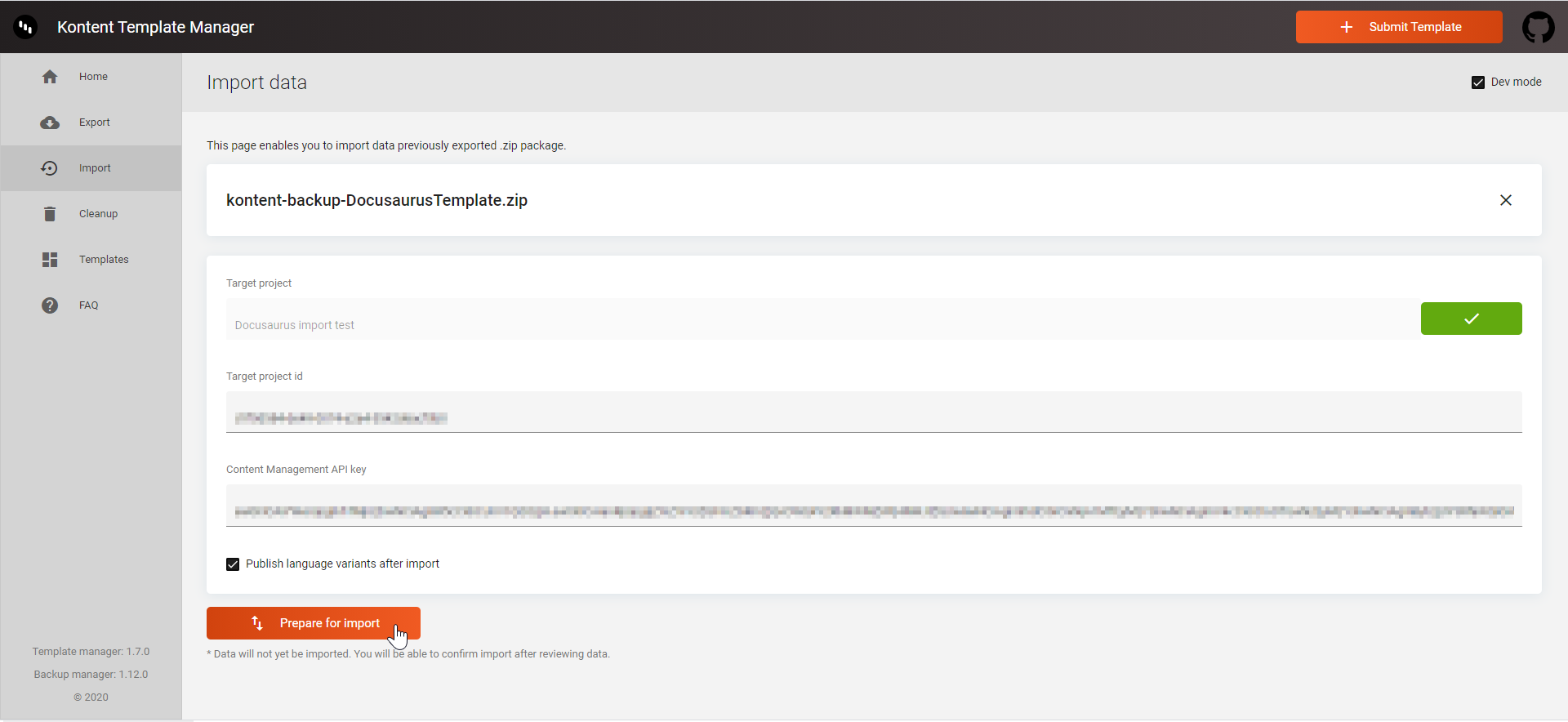 - Drop the kontent-backup-Docusaurus-Template.zip export onto the Kontent Template Manager